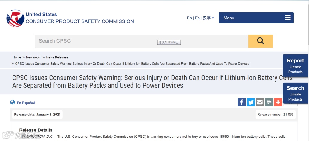 2021年01月08日,CPSC还发布了消费者安全警告:如果锂离子电池芯从电池组中分离出来并用于设备供电,可能会造成严重伤害或死亡。提醒消费者不要购买或使用散装18650型锂离子电池。