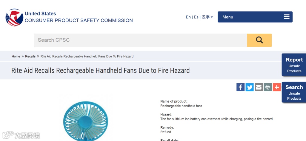 美国消费品安全委员会对手持式充电风扇发布召回通报召回通报