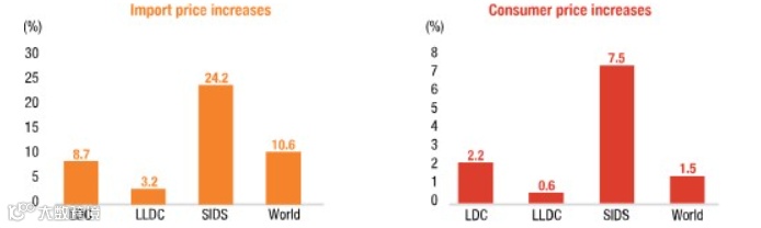 海运成本飙升对不同国家的影响不同,通常来说,国家体量越小、进口占经济比重越高的国家,受到的影响自然更多。小岛屿发展中国家(SIDS)受到的影响最大,海运成本飙升将令其消费者价格上涨7.5个百分点。内陆发展中国家(LLDC)消费者价格可能上涨0.6%。在最欠发达国家 (LDC),消费者价格水平可能会上涨 2.2%。