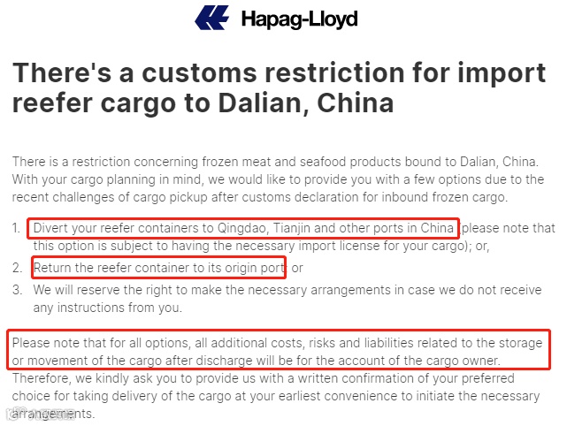 继马士基之后(马士基:暂停所有至大连的冷藏箱货物订舱!),11月22日,德国航运公司赫伯罗特在给客户的最新通知中警告,对运往中国第一大冷藏港大连的冷冻肉类和海鲜产品的冷藏箱实行限制规定。赫伯罗特表示处于对客户货物运输计划,鉴于近期入境冷冻货物报关后提货的挑战,为客户提供一些其他选择。