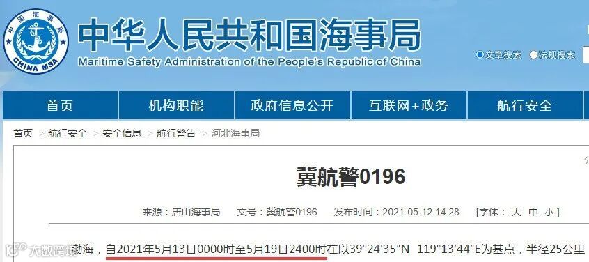 据河北海事局消息,渤海,自2021年5月13日0000时至5月19日2400时在以39°24′35″N 119°13′44″E为基点,半径25公里,正东方向至正南偏西6°、夹角96°的扇形区域内,扇形区域的2个顶点坐标分别为39°24′14″N 119°28′24″E和39°13′13″N 119°11′51″E,执行实弹射击,禁止驶入。