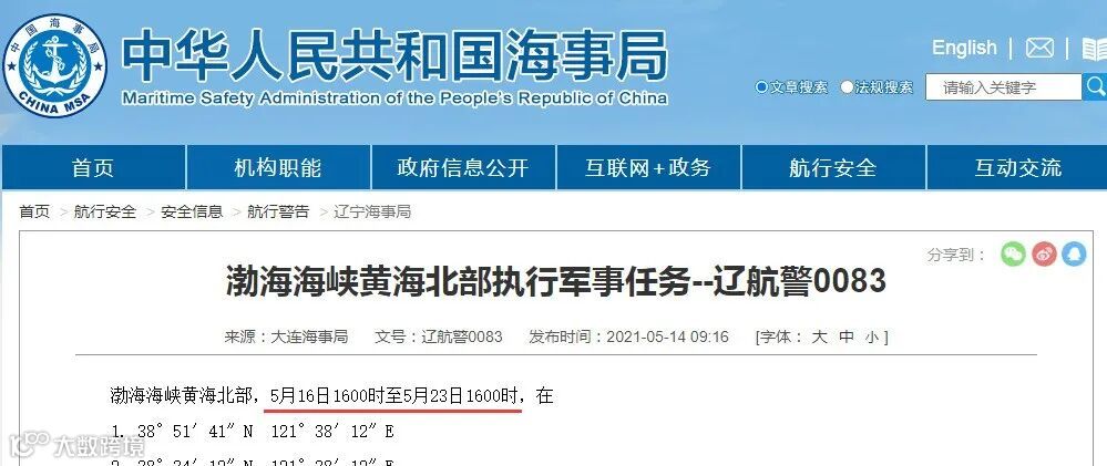 据大连海事局消息,渤海海峡黄海北部,5月16日1600时至5月23日1600时,在