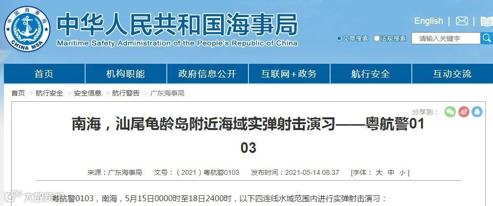 据广东海事局消息,南海,5月15日0000时至18日2400时,以下四连线水域范围内进行实弹射击演习: