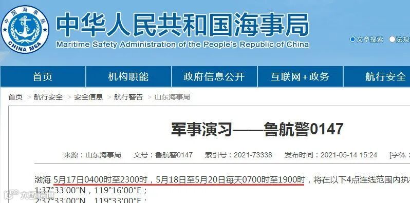 据山东海事局消息,渤海 5月17日0400时至2300时,5月18日至5月20日每天0700时至1900时,将在以下4点连线范围内执行军事任务: