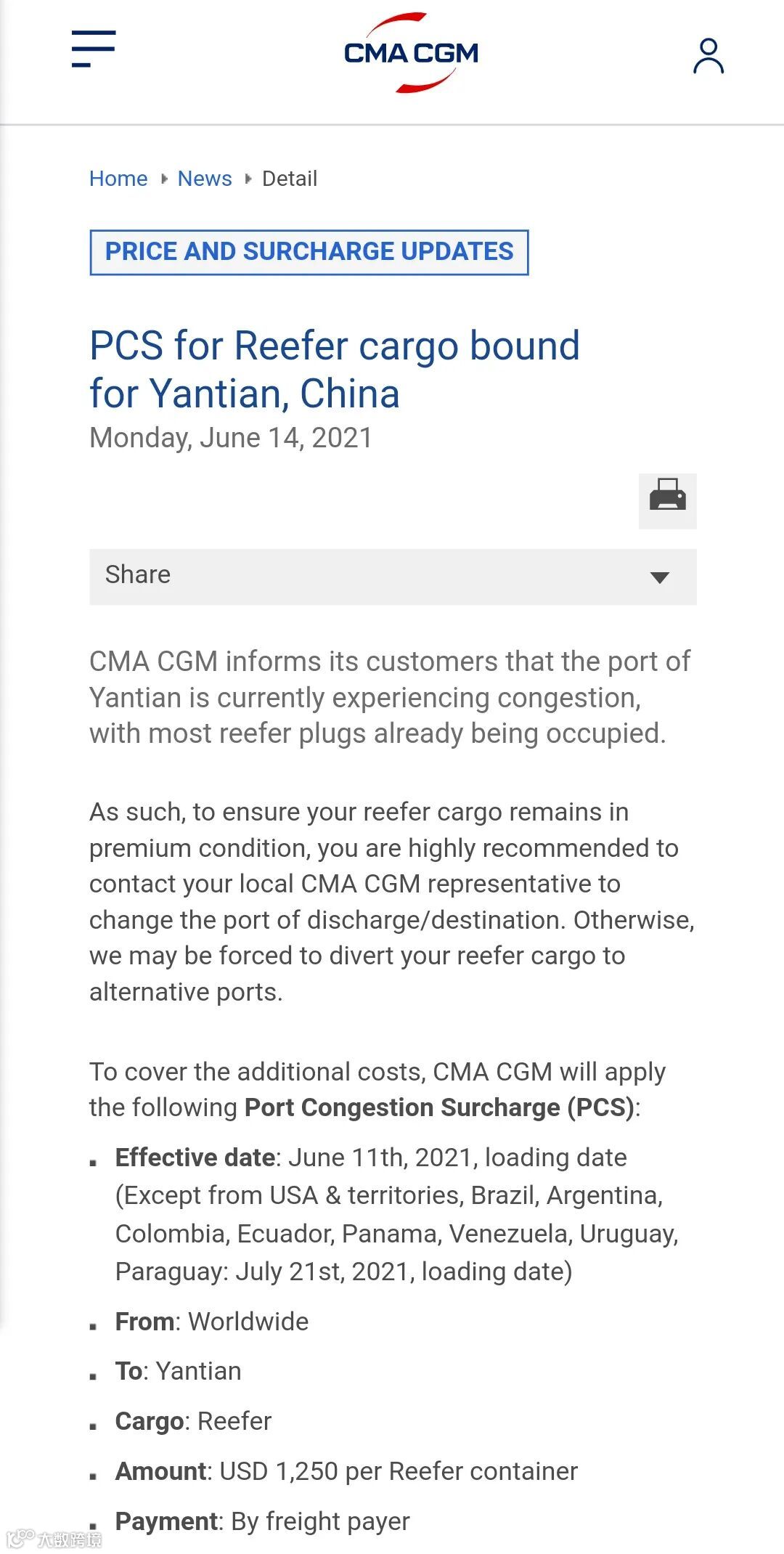 与此同时,ONE决定对每个集装箱征收1000美元的拥挤附加费,以支付因意外但必要的运输安排以及相关的插头费用、监控费用等所产生的额外费用。如要求更改目的港(COD)将入港冷藏箱从盐田卸至其他替代港口,可免除CGD和COD管理费。
