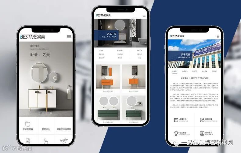 一品堂·网络部对宾美卫浴官网“web端”和“移动端网页”进行了差异化的视觉体系搭建和功能规划,在网站架构上对web端进行体验设计,从0到1实现“移动端网页”全新设计、适配,从而在提升企业网站端口便捷性的基础上,加深企业印记和用户连接,重塑具有国际引领性的企业品牌。