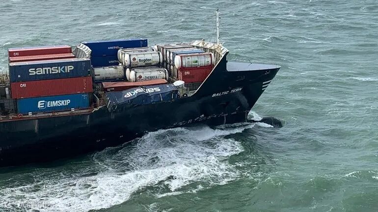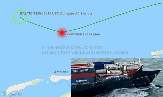 据悉,4月7日上午,一艘名为“BALTIC TERN”的集装箱船在荷兰西弗里斯兰群岛阿梅兰岛以北15海里处的北海海域,遭遇恶劣天气导致5个集装箱落水,并有部分集装箱堆垛倒塌。