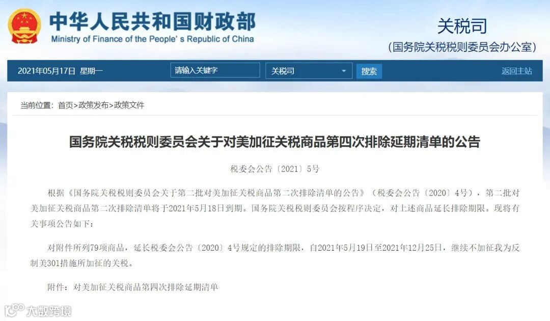 2021年5月17日,国务院关税税则委员会公布对美加征关税商品第四次排除延期清单,对《国务院关税税则委员会关于第二批对美加征关税商品第二次排除清单的公告》(税委会公告〔2020〕4号)中的79项商品,延长排除期限,自2021年5月19日至2021年12月25日,继续不加征我为反制美301措施所加征的关税。