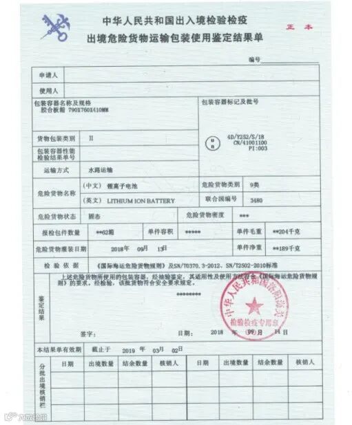 1、出境危险货物运输包装使用鉴定结果单,我们俗称危包证,如下图。