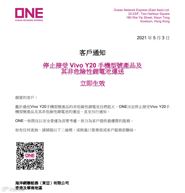 上个月,香港机场的一批Vivo手机发生火灾后,许多航空公司已经实施禁运;日本船公司ONE紧随一系列航空公司的决定,禁止运送Vivo Y20手机。但ONE似乎成为第一个采取措施的船公司。