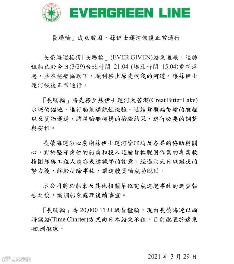 3月29日晚,“长赐”轮运营方长荣海运也在官网发布公告称,