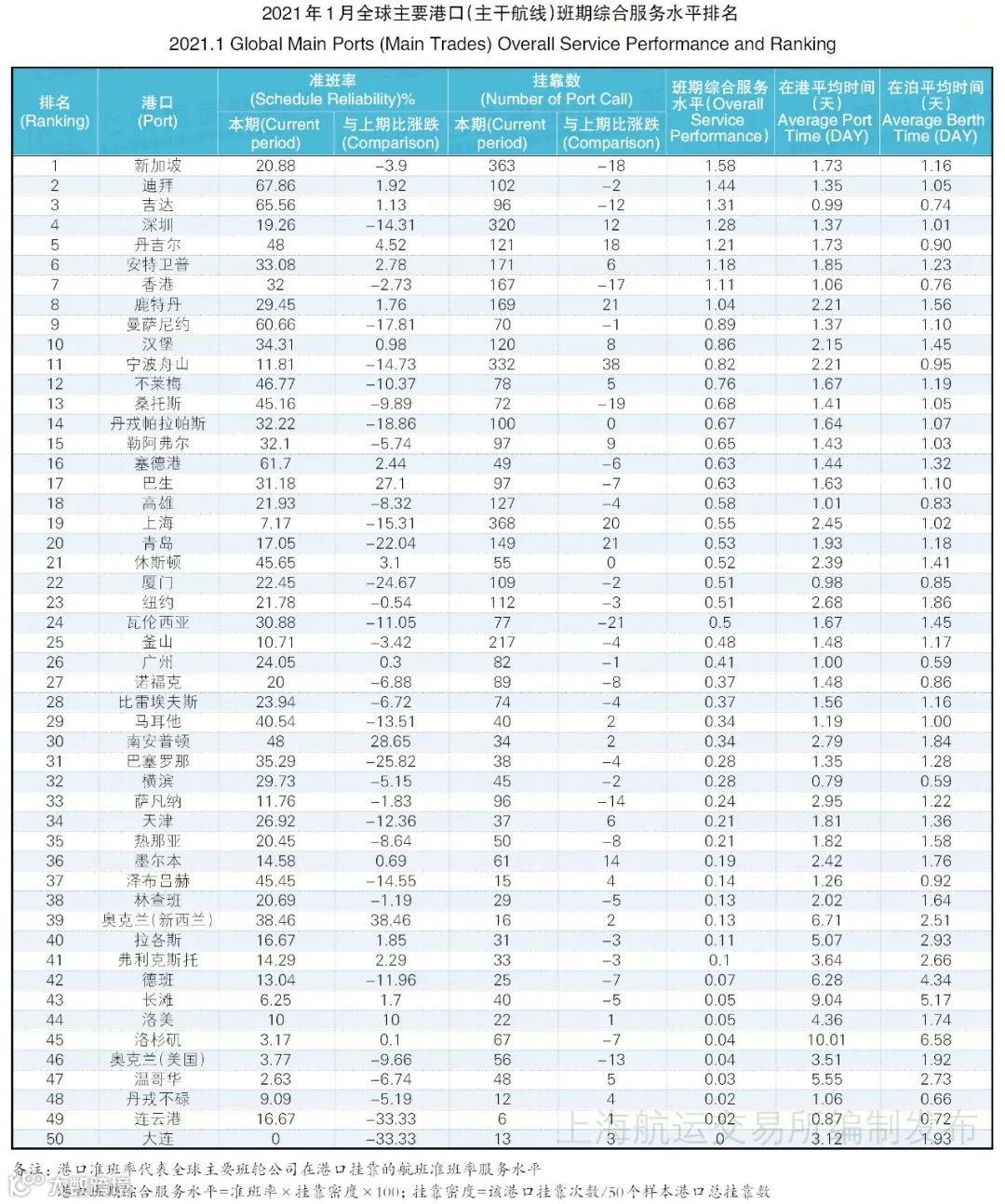 1月,全球50大港口班轮准班率的数据收集在2020年的基础上增加了在港时间和在泊时间的统计,以全面体现班期综合服务水平。1月,班期综合服务水平的前三名分别为新加坡港、迪拜港和吉达港。新加坡港继续位居第1位,班轮准班率和挂靠数分别为20.88 %和363次,降幅较2020年12月分别减少10.7个百分点和50次。迪拜港从2020年12月的第4位跃升至第2位,班轮准班率为67.86%,挂靠数为102次;吉达港从2020年12月的第6位跃升至第3位,班轮准班率为65.56%,挂靠数为96次。