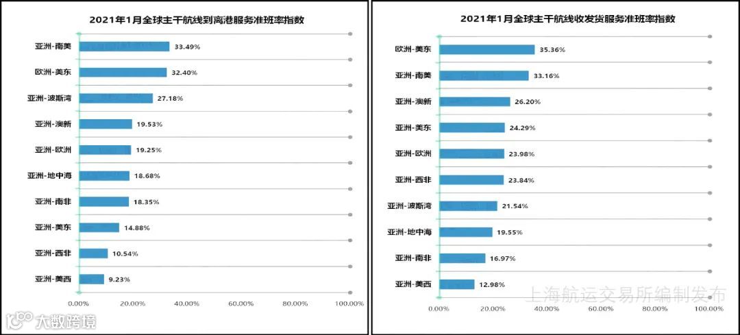 南美地区入夏后天气状况良好,减少了封港的天数,有利于船舶及时挂靠与装卸。1月,亚洲—南美航线到离港服务准班率位居首位,收发货服务准班率居第2位,分别为33.49%和33.16%,降幅较2020年12月分别减少19.02个和11.28个百分点。欧洲—美东航线到离港服务准班率居第2位,收发货服务准班率居首位,分别为32.40%和35.36%。