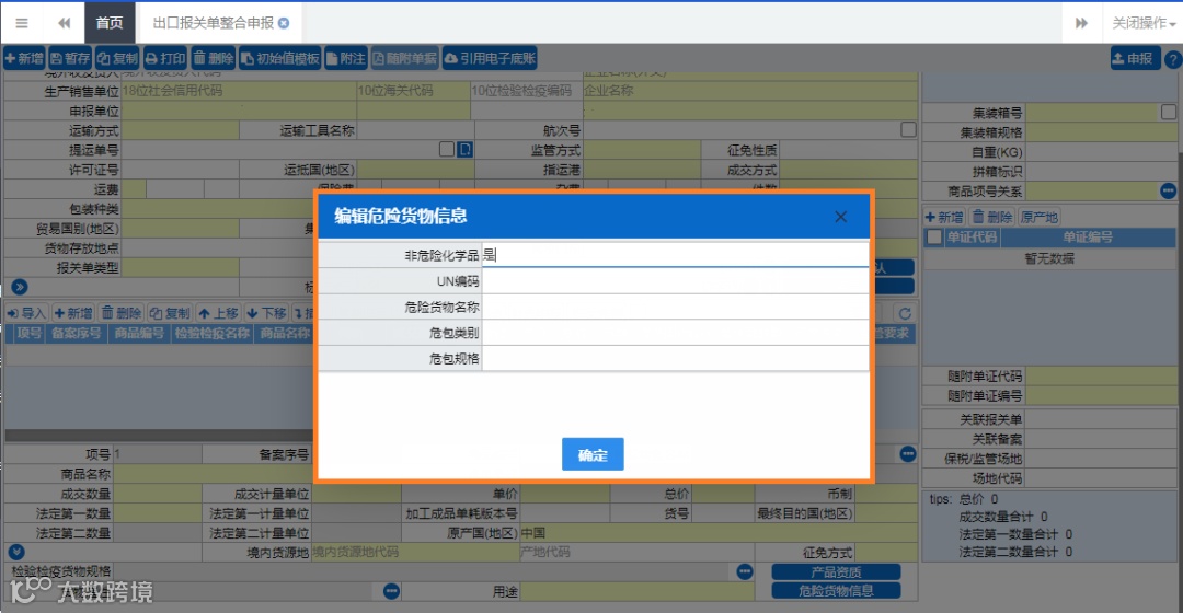 出口不属于《危险化学品目录(2015版)》且无检验检疫监管条件的商品,企业若未申请电子底账,在“出口报关整合申报”申报时,可在“危险货物信息”编辑界面中“非危险化学品”一栏选择“是”。