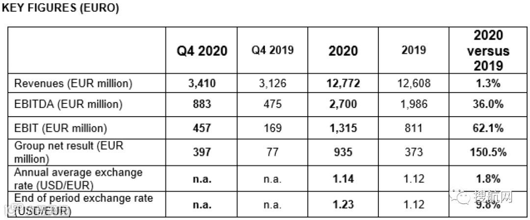 2020财年的收入增长了约3%,达到约146亿美元。这主要是由于平均运费上涨了约4%,达到1,115美元/ TEU(2019年:1,072美元/ TEU)。