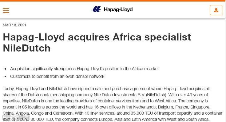 “ Hapag-Lloyd和NileDutch非常合适,我们很高兴能合作。我们将在西非的业务和专业知识与Hapag-Lloyd的全球网络相结合,进一步发展非洲业务。”NileDutch总裁Wim van Aalst在新闻稿中说。