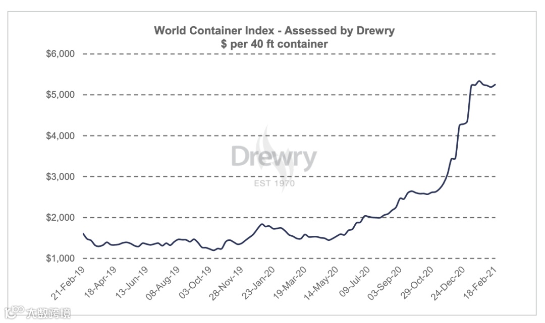 本周Drewry的全球集装箱运价综合指数上涨1.1%,至5,249.80美元/FEU。上海–洛杉矶的即期运价上涨了3%,至4,348美元/FEU。
