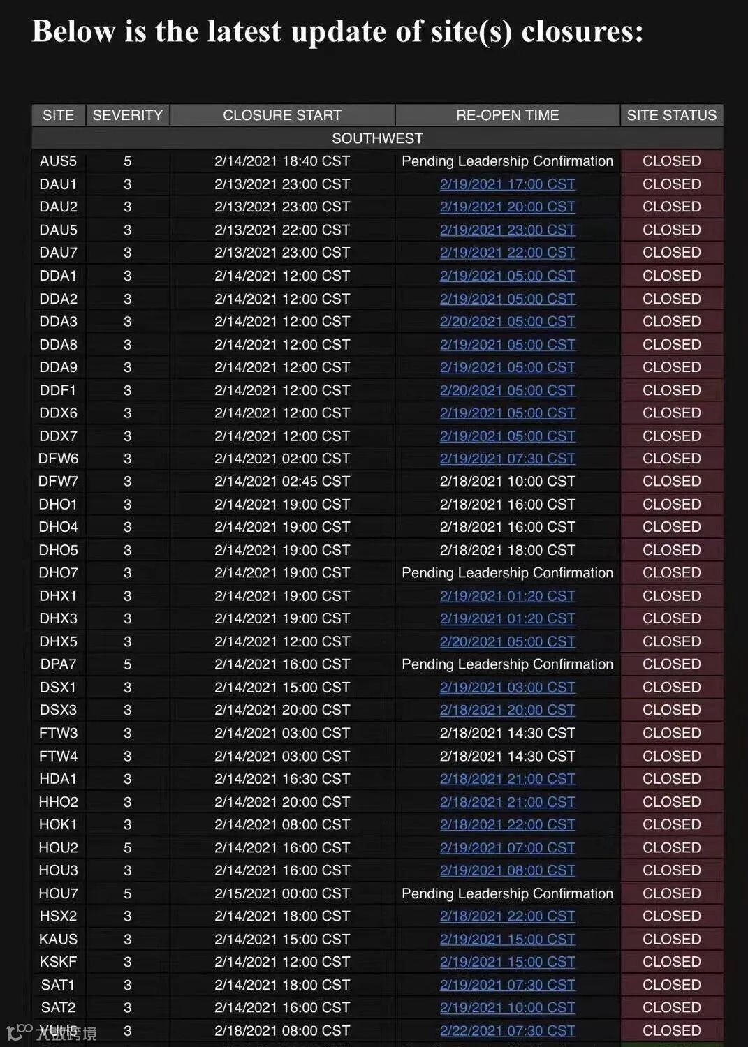 受暴雪影响,亚马逊称暂时关闭德州等8个州的部分设施,根据物流商最新反馈,由于美国暴雪封路,很多FBA仓库都已关闭,预计2月底才能恢复收货,涉及仓库多达70多个,下图为部分关闭仓库名单。