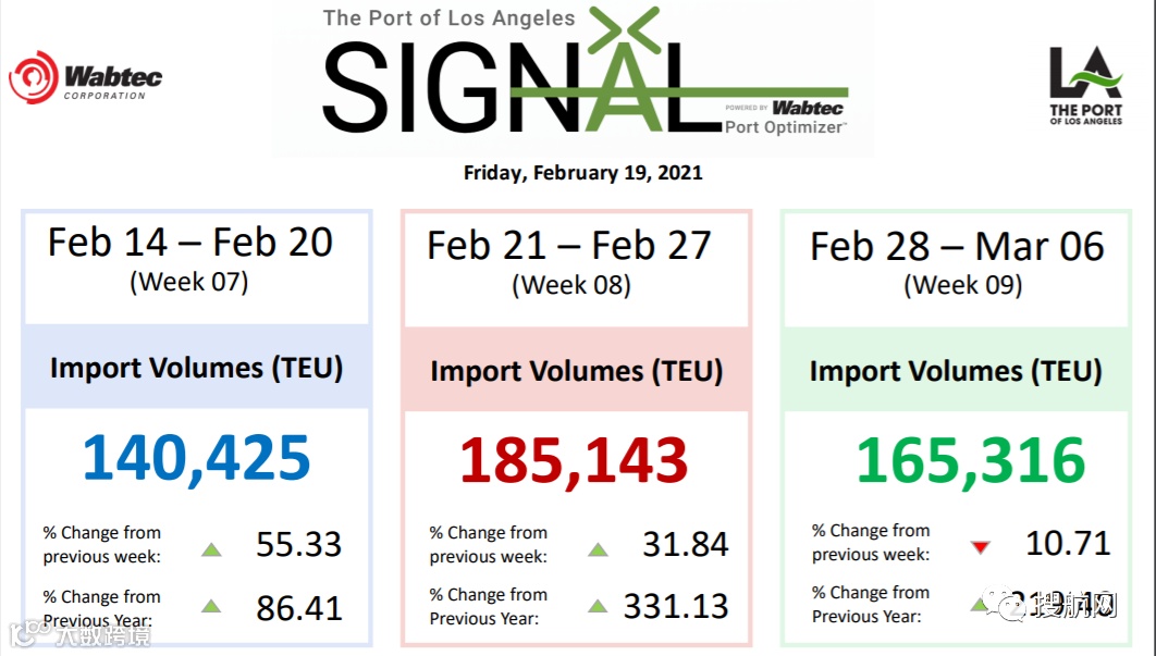 根据LA 's Signal的数据,本周将有140,425 teu的货物在港口卸货,同比增长86.41%。下周预测为185,143 teu,下下周为165,316 teu。