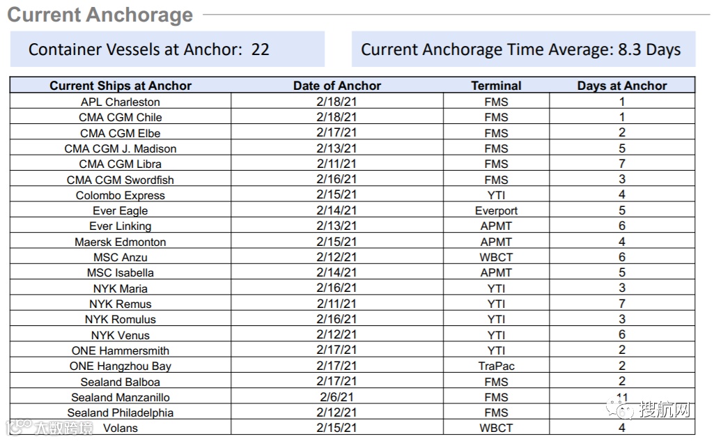 “目前前往洛杉矶的船只中约有15%会直接停泊。85%的船只会抛锚停泊,且平均等待时间一直在增加。船舶从去年11月约为两天半锚固时间,到目前2月为止,停泊时间为8天。”