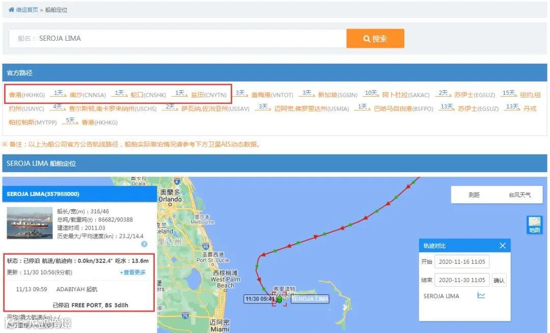 目前,“SEROJA LIMA”号没有到达下一目的港,而是于11月26日转往巴哈马岛西的自由港(Freeport)。