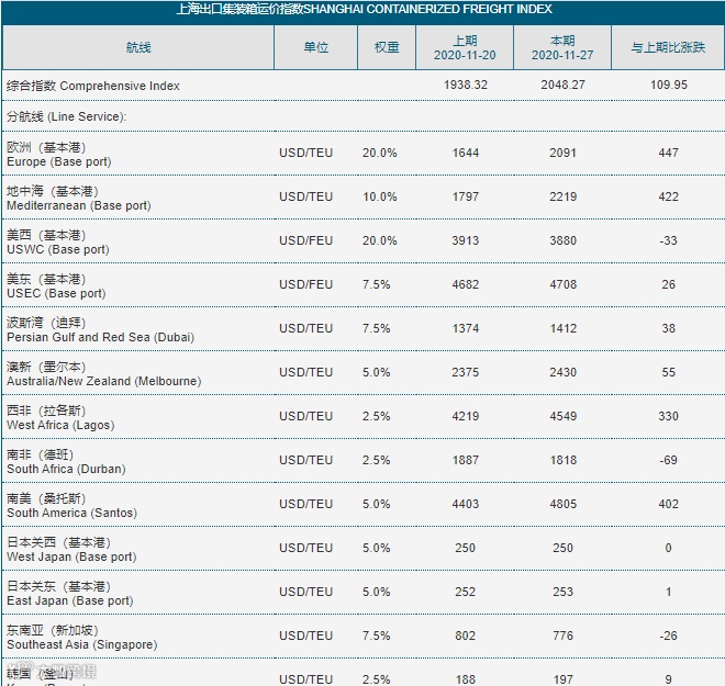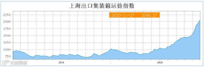 11月27日,上海出口至欧洲基本港市场运价(海运及海运附加费)为2091美元/TEU,较上期上涨27.2%。