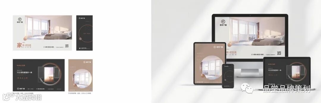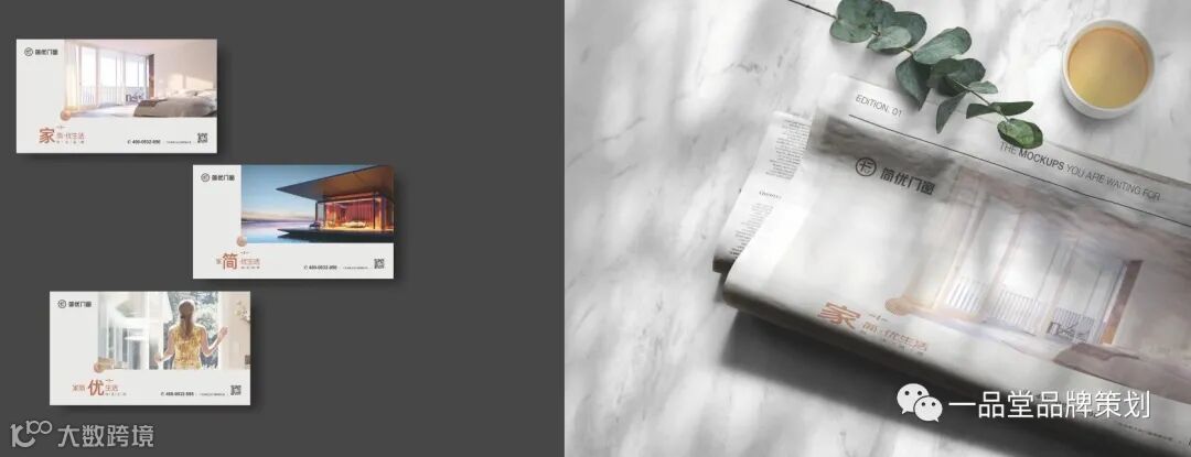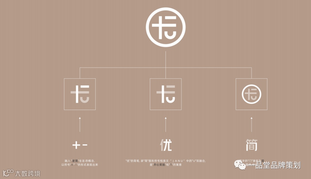 以门窗属性作为出发点,简的门演变为圆,寓意了守护与圆满之意;优的简笔、家“简”图形符号和字母“U”融合,“寓意开心的笑脸”和“1”,融入了“家简”生活的概念,以符号“+”“-”的形式表现出来。