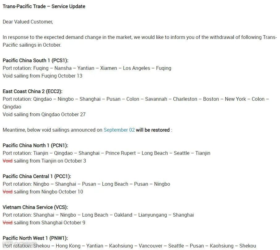 本周,海洋联盟成员东方海外(OOCL)宣布将恢复跨太平洋航行9次停航中的六次。