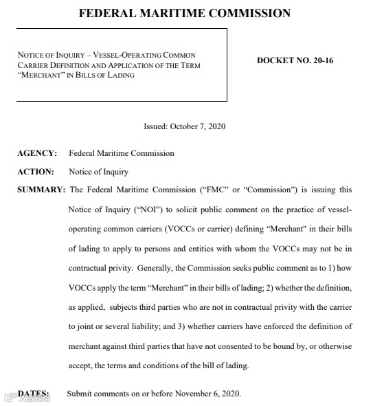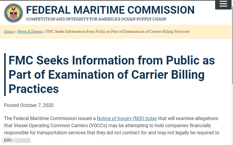 FMC调查的目的是确定有船承运人针对没有与船公司直接订立合同的第三方强制执行收取运费以及其他滞期费等费用是否存在不公平或不公正。