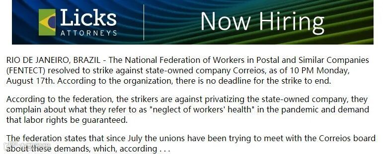 此前,部分邮政和电报公司员工已于3月11日开始罢工,并向巴西邮政局表示,集体罢工抗议将持续至2021年。但至今,邮政局一直无视该抗议。