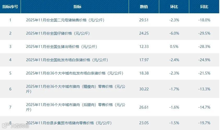 农业农村部的数据显示,2025年11月份,全国二元母猪、仔猪、批发市场白条、猪肉零售价格等均呈现环比下降趋势,仅有生猪价格环比略微上涨了0.5%。