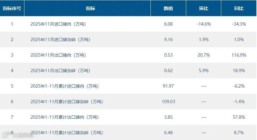 此外,猪肉进出口方面,2025年11月份我国猪肉进口延续下降趋势,进口量仅为6.08万吨,环比下降14.6%,同比下降达34.3%。而猪肉出口方面继续增量,2025年1-11月累计出口猪肉同比增加57.8%。