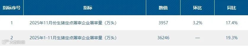 究其原因,很简单,猪还是多!农业农村部监测数据显示,2025年11月生猪定点屠宰企业屠宰量为3957万头,环比增3.2%,同比增17.4%。2025年1-11月生猪定点屠宰企业屠宰量为36246万头,同比增长19.3%。