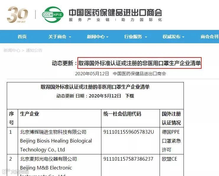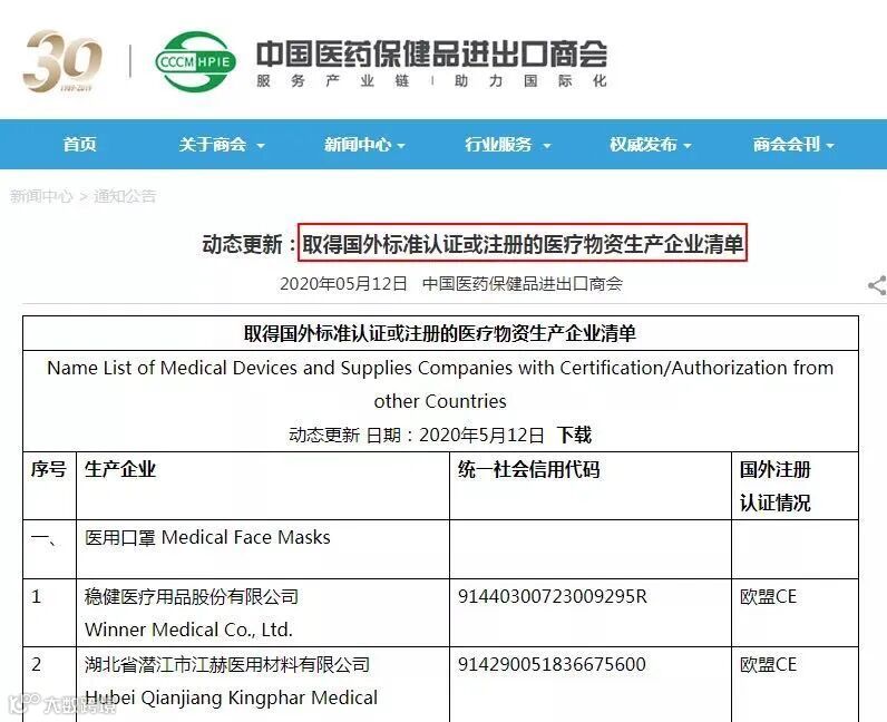 5月12日,中国医药保健品进出口商会官网于再次更新了取得国外标准认证或注册的医疗物资生产企业清单与取得国外标准认证或注册的非医用口罩生产企业清单。