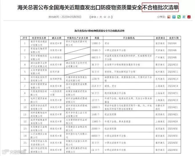 海关总署公布16家出口防疫物资不合格企业名单