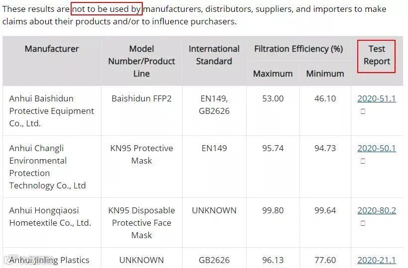 以下为美国CDC对中国口罩检测结果部分截图: