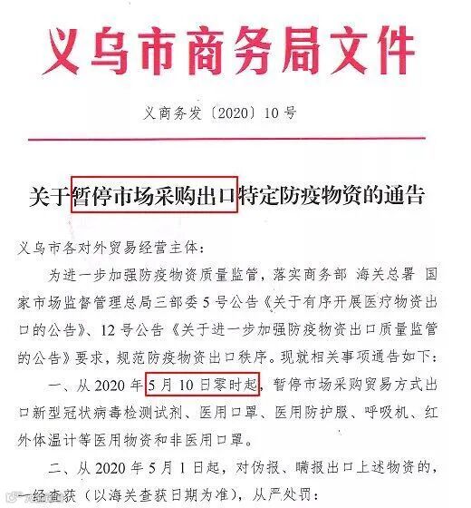 宣布从5月10日起,全国范围将暂停以市场采购贸易方式出口新型冠状病毒检测试剂、医用口罩、医用防护服、呼吸机、红外体温计等医用物资和非医用口罩。