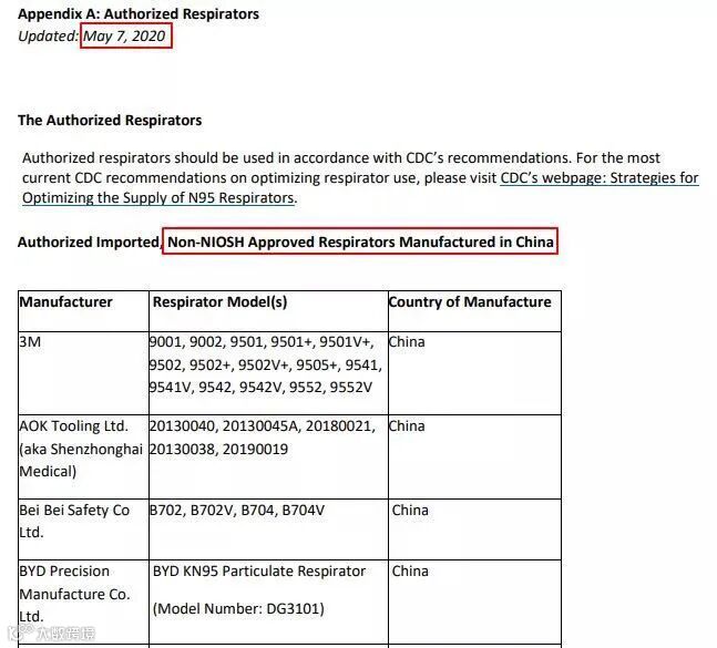 但在5月7日,FDA表示在发现大量低质量产品后,撤回了超过65家中国制造企业的N95口罩许可,这批企业都在4月3日FDA授权的80家中国口罩制造企业中,获得FDA认可的中国生产的非NIOSH认证的口罩只剩下14个厂家。