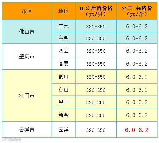 有红绿颜色部分是相对昨天有所变动的猪价;
