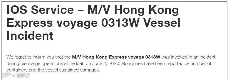 据船公司赫伯罗特(Hapag-Lloyd)宣布,6月2日,其13,000TEU的集装箱船“Hong Kong Express”在吉达港(port of Jeddah)卸货的过程中发生一起意外事故,造成该船和若干集装箱遭受损坏。