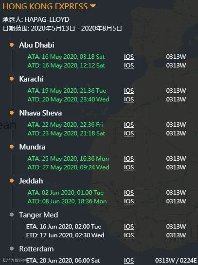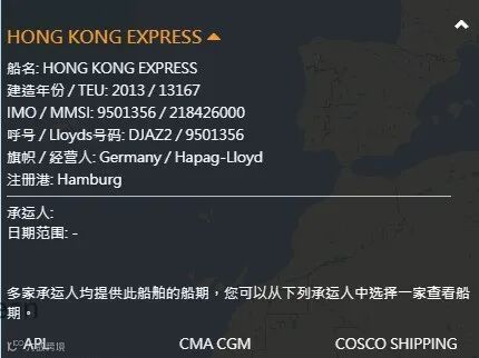 根据大船期的资料显示,“Hong Kong Express”轮服务于IOS航线,船上共舱的船公司还包括:中远海运、达飞轮船、ONE、东方海外以及APL。