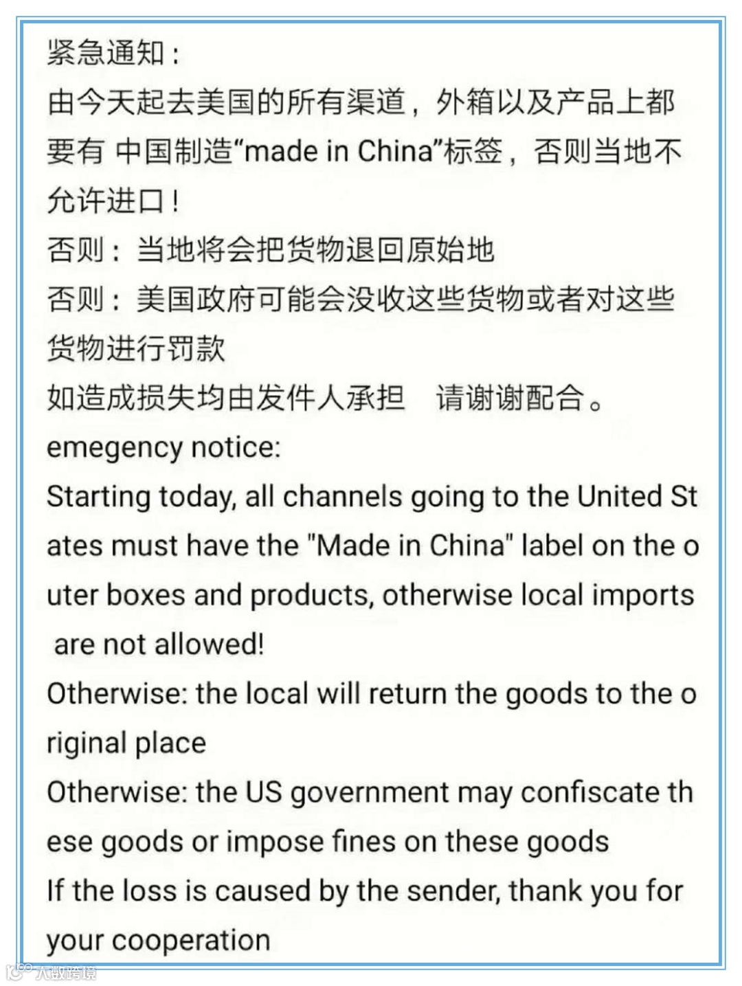 出口美国的产品,一定要贴Made in China标签,外箱和每个产品上都要贴上“MADE IN CHINA”标签,否则会被当地海关扣下、退回。