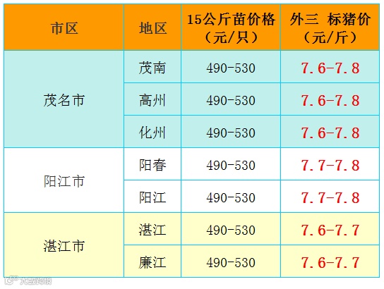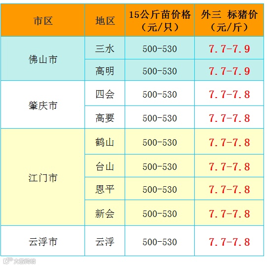 有红绿颜色部分是相对昨天有所变动的猪价;