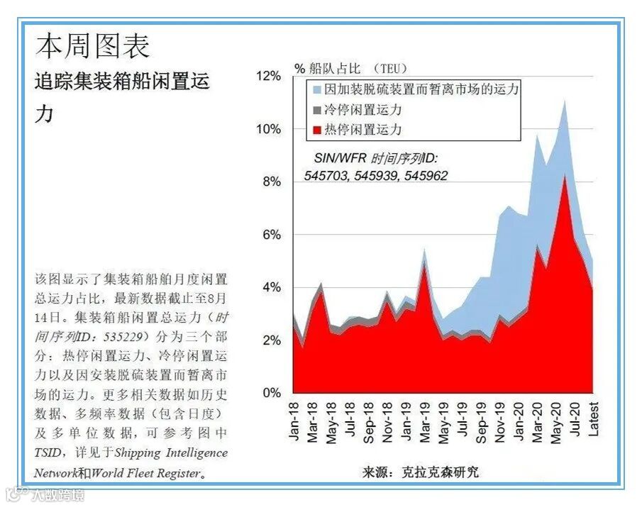今年上半年后期,新冠疫情对集装箱船市场的负面影响逐步减少,6月全球集装箱贸易量降幅收窄至5%,7月集装箱船靠港量的同比降幅收窄至2%。班轮公司的业绩逐渐改善,期租收益有所提升。在此背景下,集装箱船总闲置运力占比开始回落,8月中旬降至4.9%(创下2019年10月之后的最低水平,其中包括1%的暂离市场进行脱硫装置安装的集装箱船运力)。在经历了大幅飙升之后,集装箱船闲置运力目前正在下降,这表明市场预期较之前似乎变得乐观起来。