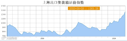8月28日,上海航运交易所发布的上海出口集装箱综合运价指数上涨79.56点到1263.26点(8月21日指数为1183.70点),继续大幅上扬,较上期上涨6.7%。大部分航线运价上调幅度较大,综合指数上涨。美东突破4200美元/FEU大关。