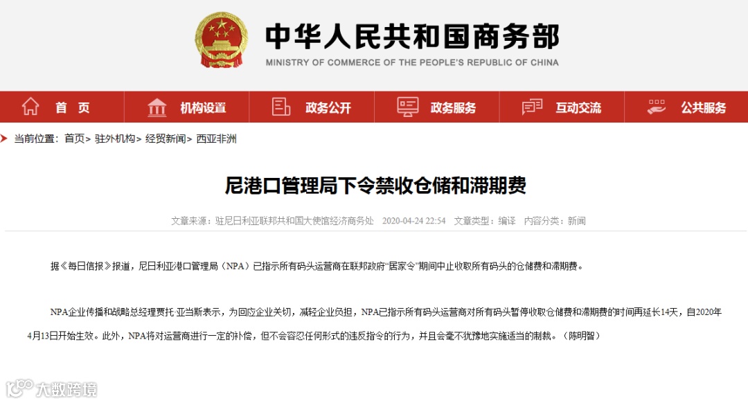 另据尼日利亚之声报道,尼日利亚托运人理事会(NSC)周四披露,经过与相关协会、公会的会议谈判,从港口运输货物的运输收费下调30%。新的收费标准于4月22日生效,并在COVID-19期间持续有效。