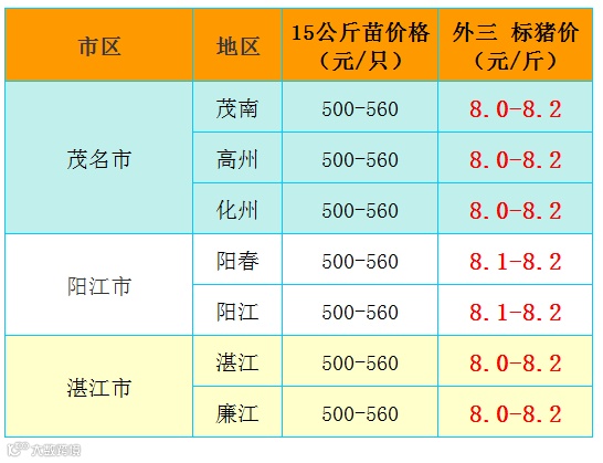 有红绿颜色部分是相对昨天有所变动的猪价;