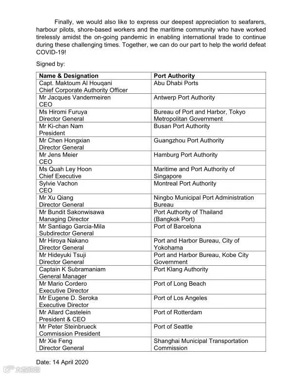 声明呼吁,各大港口要建立开放的沟通渠道,促进更密切的协作,以便各港口和海事部门能够分享抗击新冠肺炎的经验,并及时交流信息。