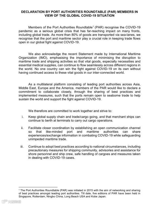 PAR成员认为,新冠肺炎疫情是一场严重的全球危机,对包括全球贸易在内的多个方面,产生深远影响。“在全球共同对抗新冠肺炎的过程中,港口和海运部门在保持贸易流通畅通方面,发挥着至关重要的作用。”