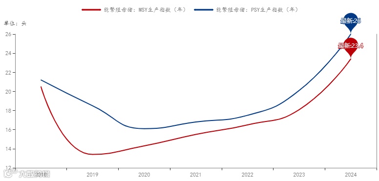 虽然从能繁母猪的数量来看,2024年年末同比减少了1.6%,2025年1月末同比减少了0.1%;但从母猪的生产性能来看,现在无论是PSY还是MSY都有大幅提升,据Mysteel监测数据显示,2024年年末,PSY值在26头/年,MSY值在23.4头/年,这就意味着每头母猪每年能够生产更多的仔猪,并且仔猪的成活率也会提高,从而增加生猪的存栏量和出栏量;2024年全年生猪出栏70256万头,2025年生猪出栏量或呈现增长优势。